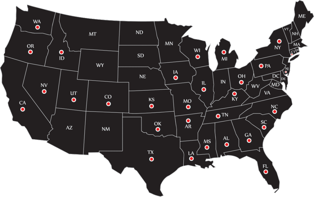 New York, New Jersey, Florida, California, North Carolina, Virginia, Washington, Massachusetts, South Carolina, Oregon, Oklahoma, Pennsylvania, Tennessee, Minnesota, Illinois, Texas, Georgia, Arizona, Michigan, Missouri, Colorado, Kentucky, Indiana, Louisiana, Alabama, Maryland, Connecticut, Ohio